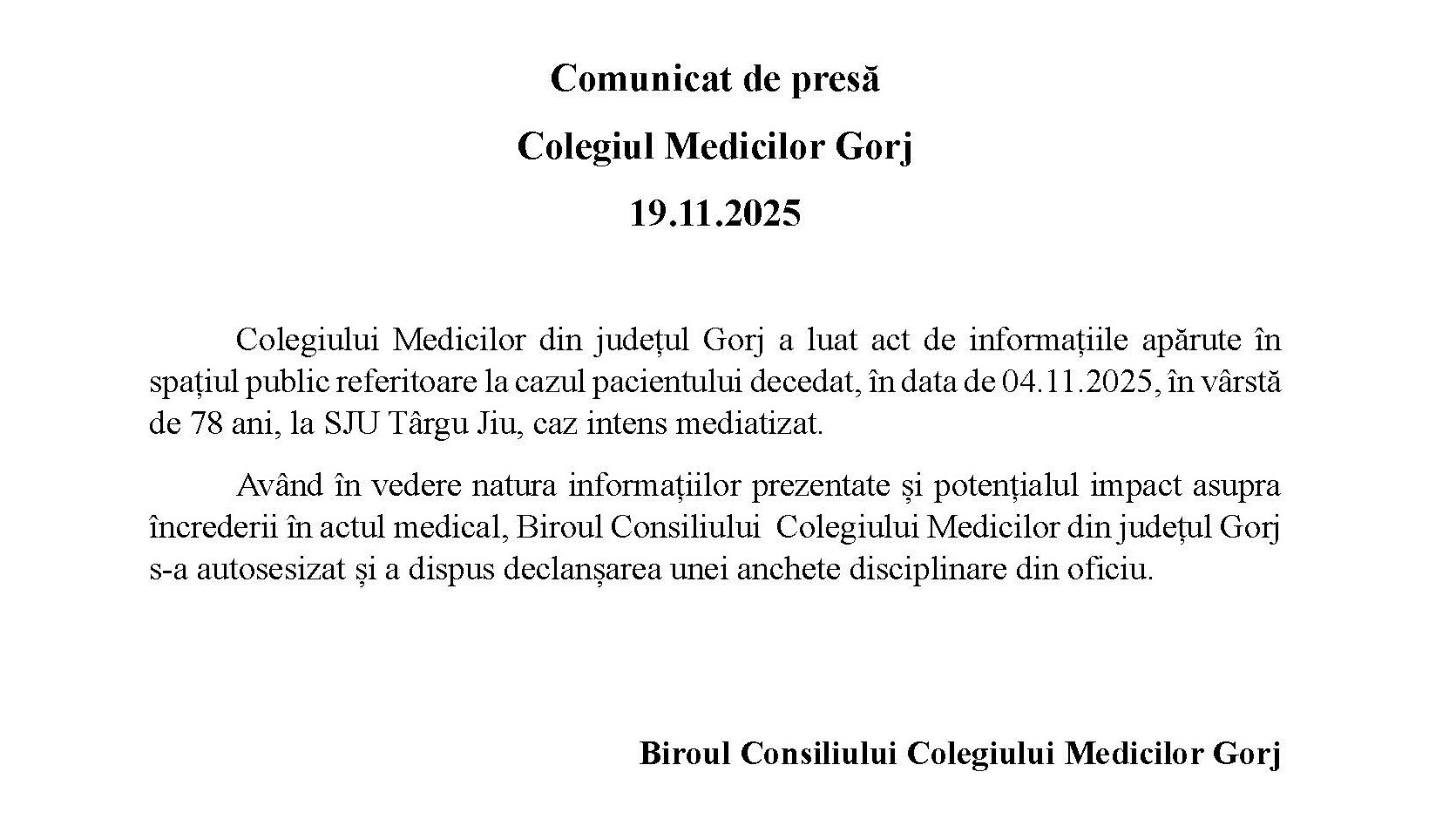 Ca urmare a informațiilor apărute în spațiul public privind cazul pacientului Drăgan Marius Andrei, în vârstă de 16 ani, care a decedat la Spitalul Județean de Urgență Tg-Jiu, Colegiul Medicilor din județul Gorj s-a autosesizat, dispunând declanșarea unei anchete disciplinare din oficiu cu privire la situația semnalată.